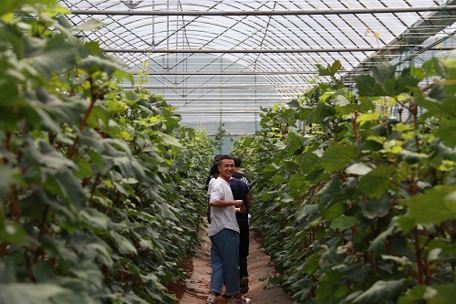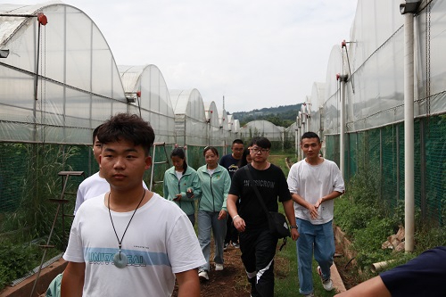 首先,同学们在闫霏书记的陪同下对白马桃花庄园进行实地考察调研。闫霏书记为同学们介绍了目前农村土地有序流转达3160多亩,白马桃花庄园已经完成投资7000余万元,种植黄桃、车厘子、苹果等30个特色林果品种,栽植特色林果10万余株等,一年四季都可赏花尝果、游乐体验。有了这些背景介绍,同学们全面了解到了种植基地的信息,在相关人员的带领下,进入了葡萄种植基地进行参观学习,农户们热情地邀请同学们品尝大棚中香甜可口的果实,同时,同学们与农户进行了亲切地交谈,了解到此时葡萄难以售卖的相关情况。